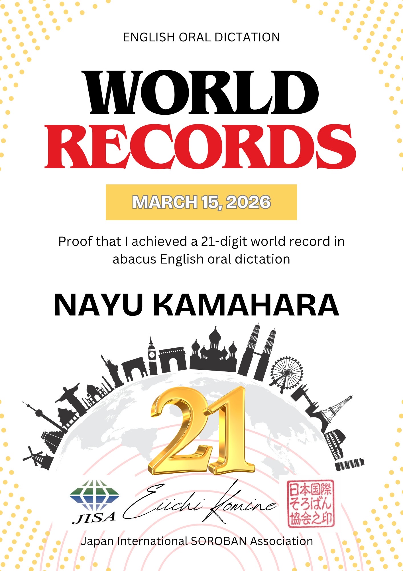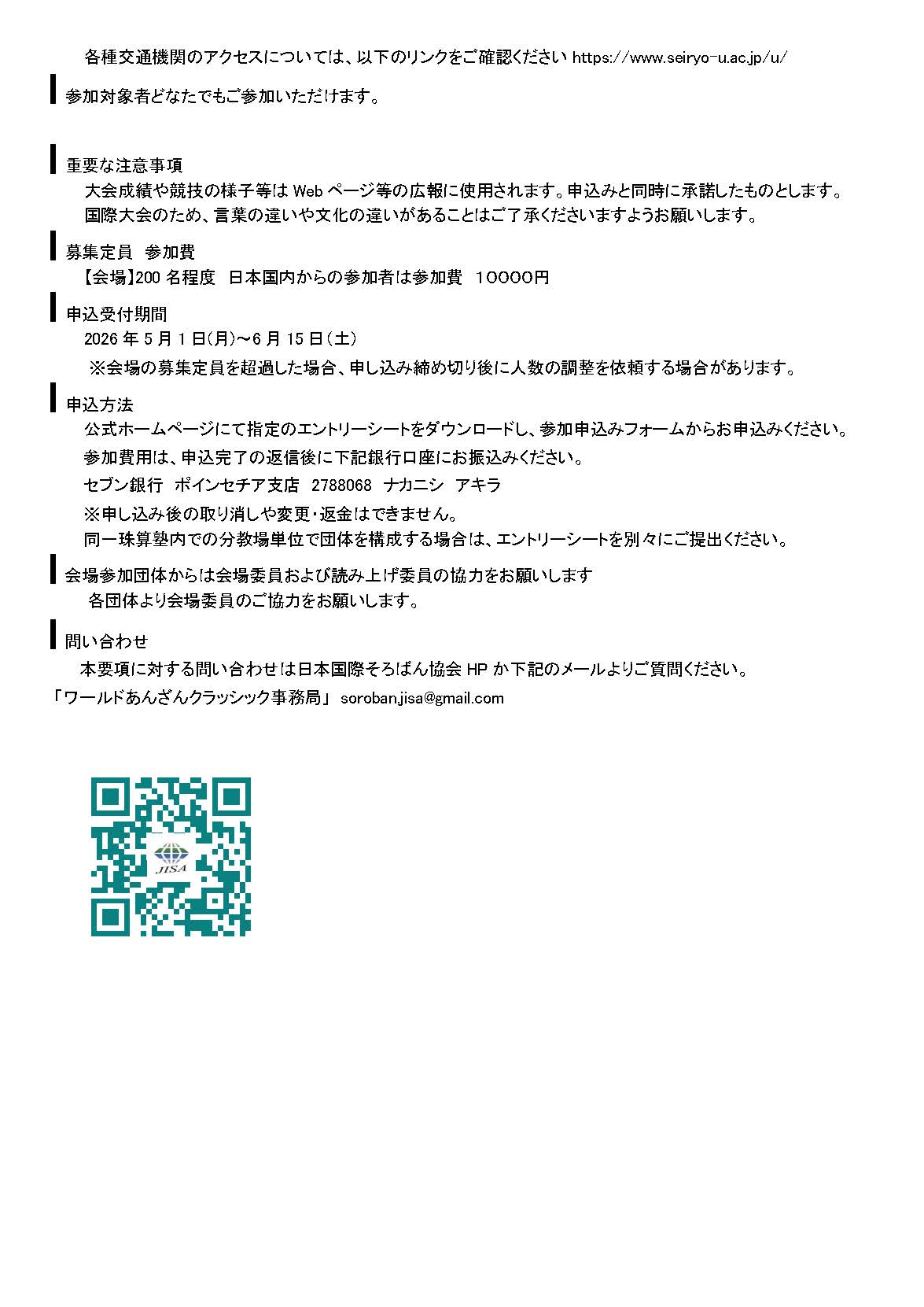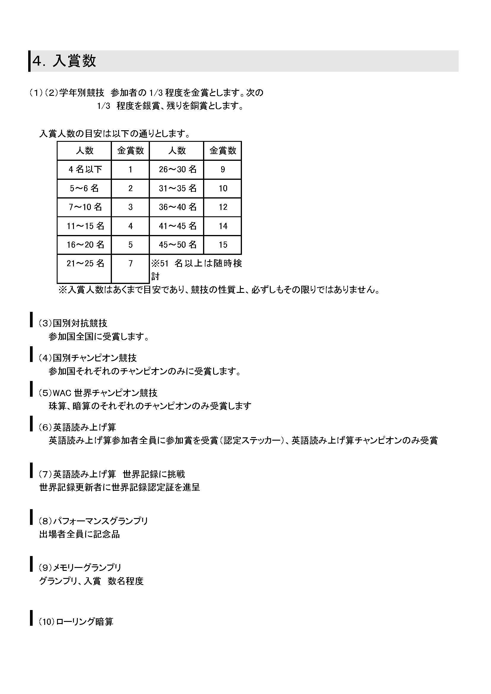日本が発行する級・段の検定を世界の人達にも受験していただき、そろばんの上達・実力向上に貢献していき、国際基準の競技大会の実施により、日本から発信することで世界的に珠算界とそろばん業界の活性化を図る事を目的としています。