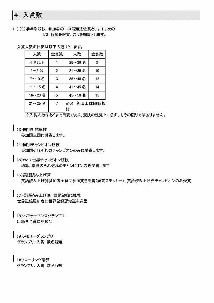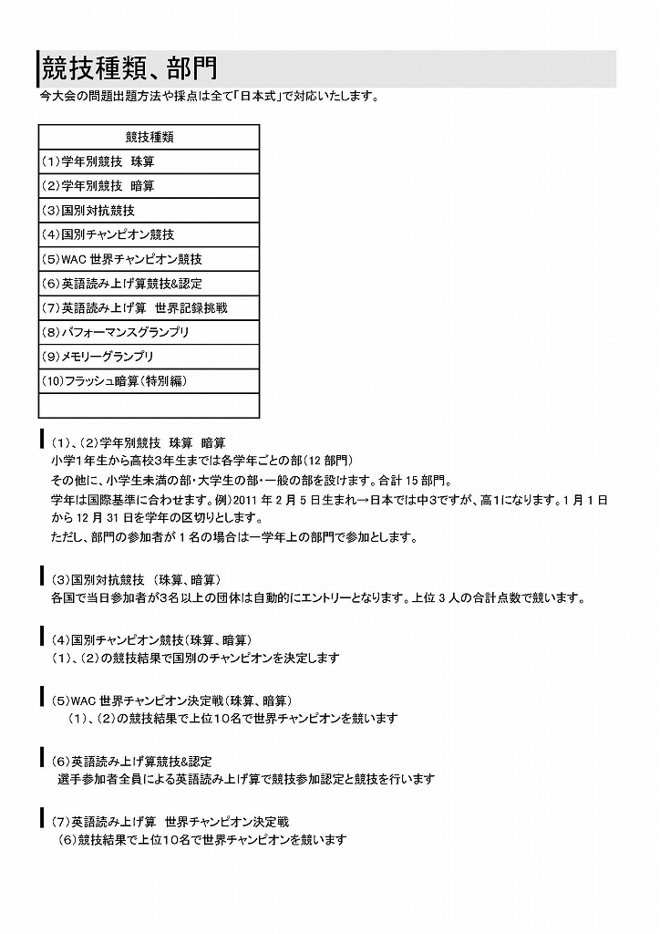 日本が発行する級・段の検定を世界の人達にも受験していただき、そろばんの上達・実力向上に貢献していき、国際基準の競技大会の実施により、日本から発信することで世界的に珠算界とそろばん業界の活性化を図る事を目的としています。